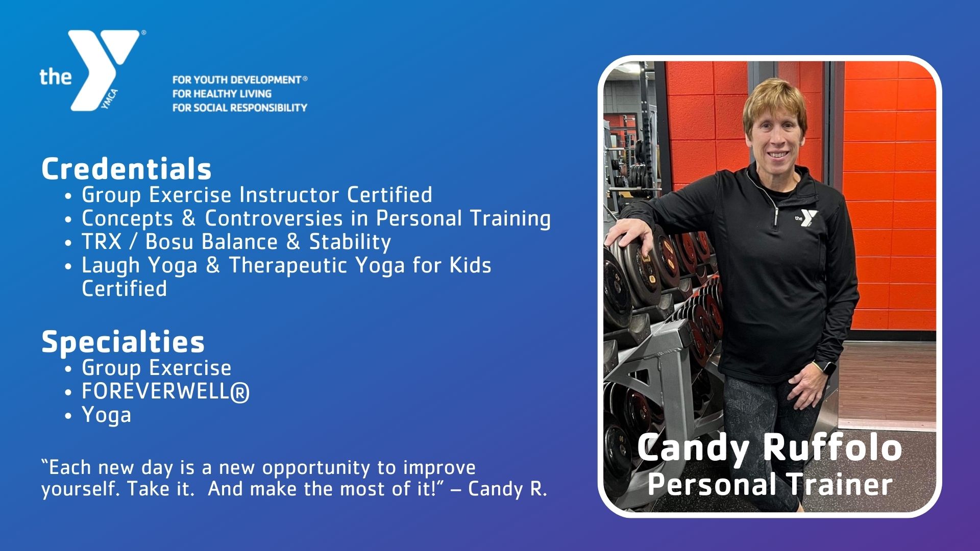 One-on-one or small group training to reach your wellness goals. Whether it is weight-loss, muscular strength/flexibility, injury prevention, or post-rehabilitation; a Y personal trainer will help you attain your goals. Personal Training is for ages 12+ and all ability levels.